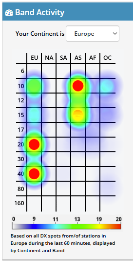 Eine separate Grafik "Band Activity" zeigt an, auf welchem Band besondere Häufungen/Aktivitäten bezogen auf die jeweiligen Kontinente sind.