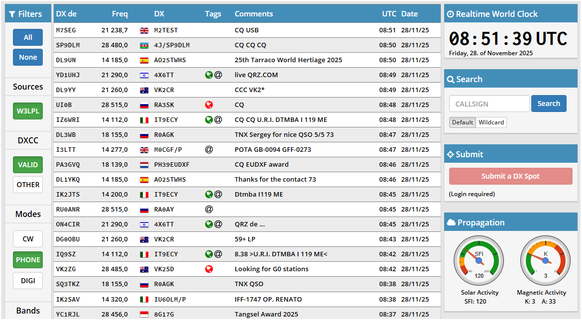 Das Cluster "dxheat.com" ist ein Cluster, dass sehr gut individualisierbar ist. So habe ich die Bänder 10m, 12m, 15m, 17m und 20m für die Betriebsart Phonie und das Gebiet "weltweit" eingestellt da meine Antenne unterhalb 20m kaum performant ist und ich CW weder kann noch darf und ich für Digitalfunk ein anderes Gerät verwende wenn ich das überhaupt mache.