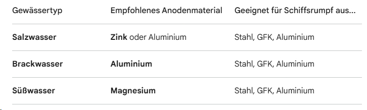 Die Wahl des Anodenmaterials hängt nicht nur vom Schiffsmaterial, sondern massiv vom Gewässer ab, in dem man fährt: